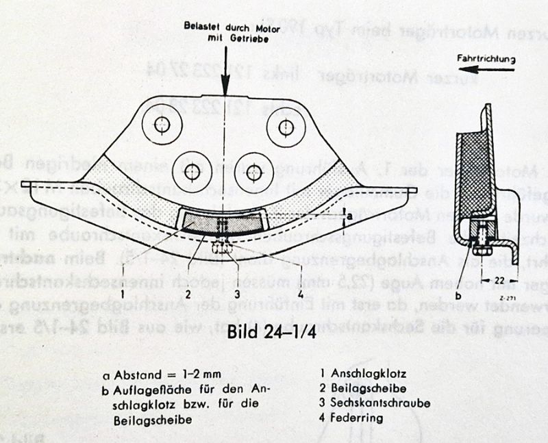 For the 6-cylinder 220a and 219, a steel stop-block is screwed into the rear and lower metal plate, i.e. the one attached to the chassis. This will prevent the engine/gearbox from sinking so far to the rear edge that the function of the gear levers is affected in the event of a collapse of the rubber. Under the stop block is a 2mm thick washer, or shims, with the form and width of the stop-block.