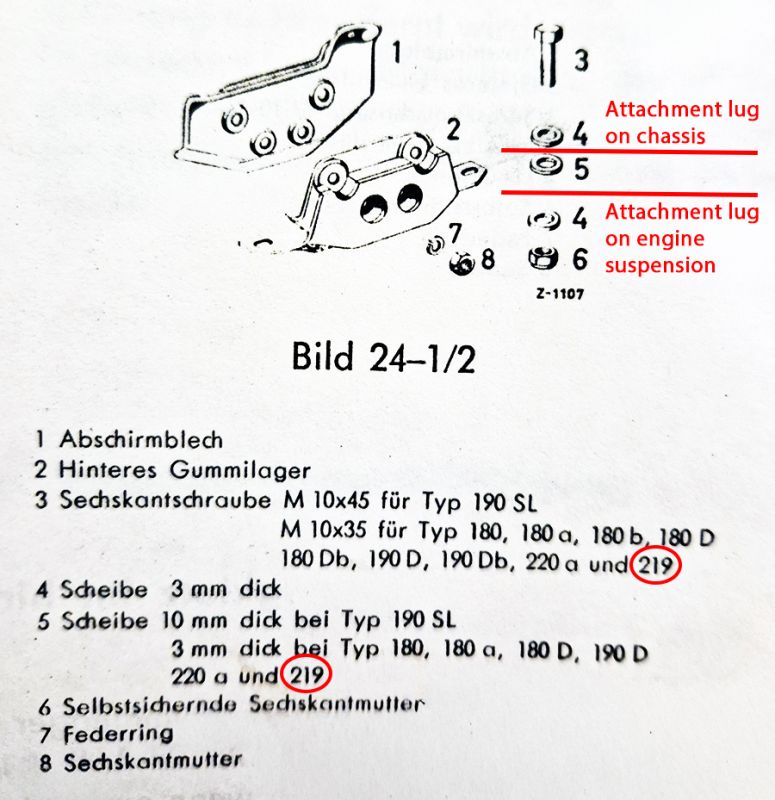 Some of the early 4-cylinder Pontons, incl 190SL, as well as early 219 and 220a (maybe all 220a?!) had a three-point engine suspension instead of the four-point suspension (see drawing above and pictures in the gallery below). This means that instead of two “normal” mounts in the rear, they had only one, fitted on the rear of the gearbox. Later 4-cylinder Pontons incl late 190SL as well as late 219 and all 220S/SE had a four-point suspension.